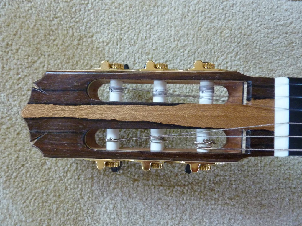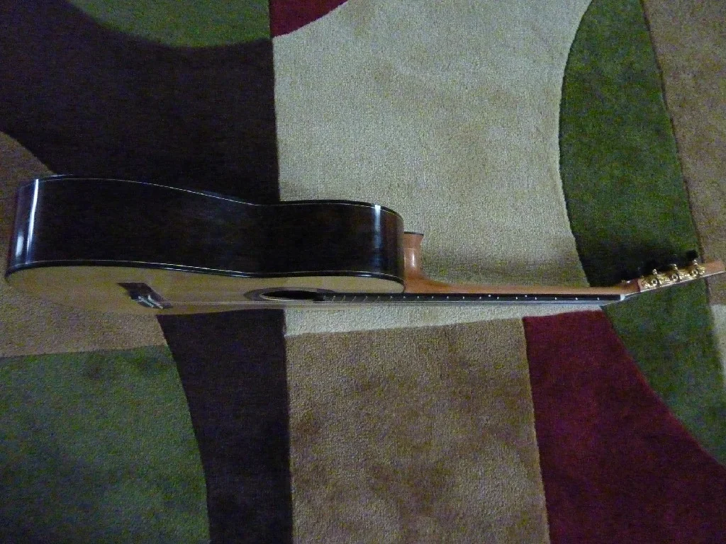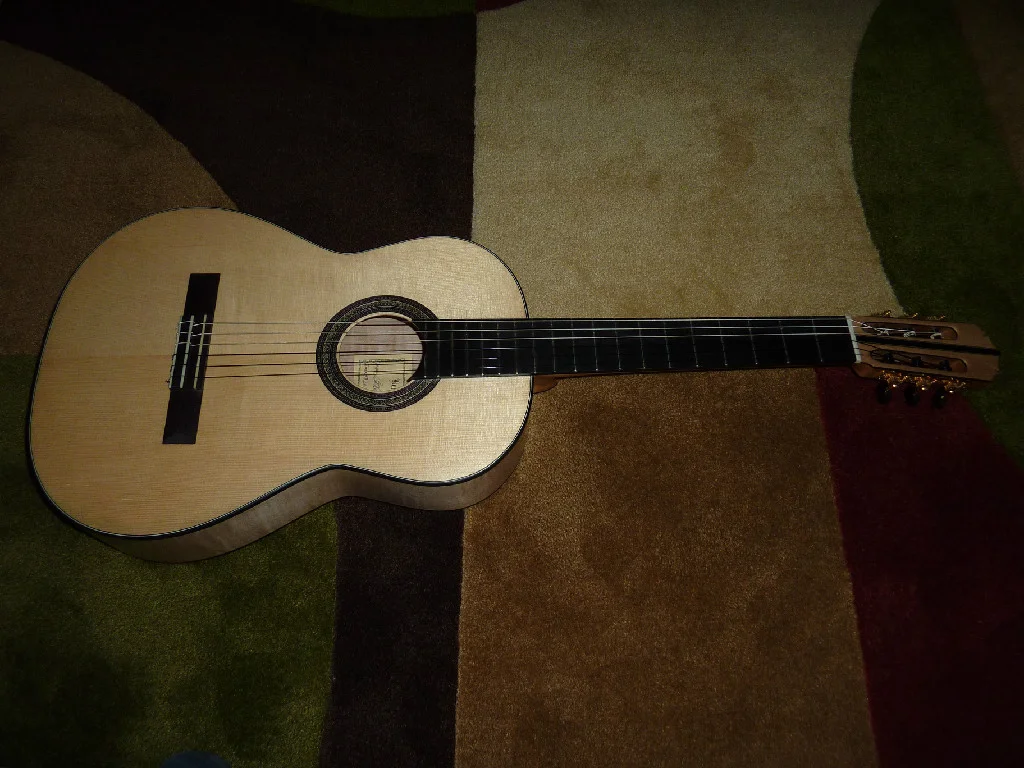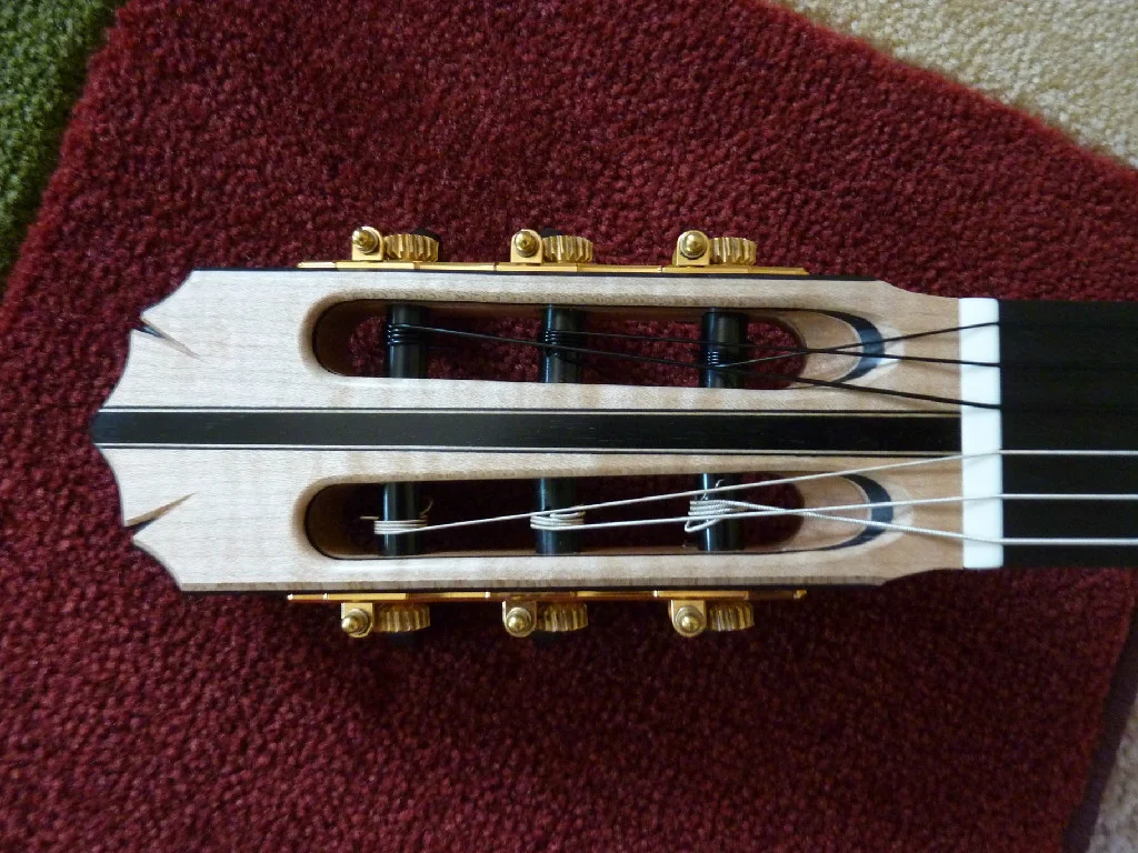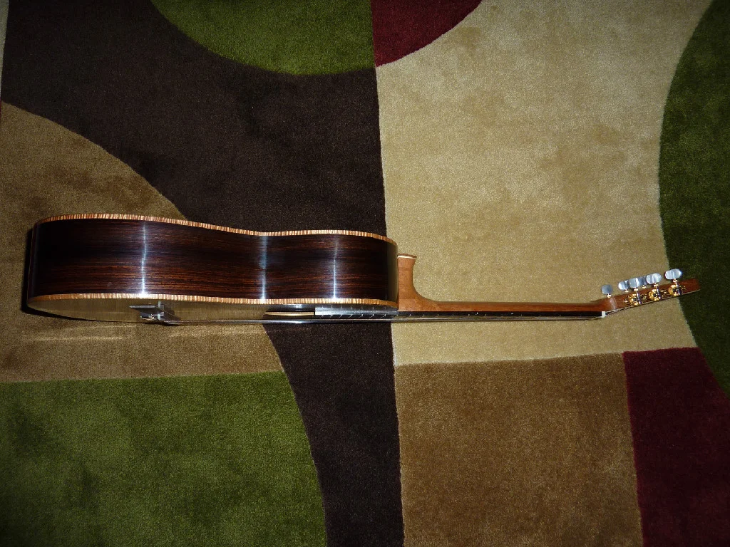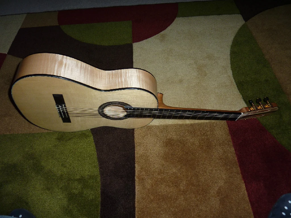 This instrument has flamed Maple sides and a 4-piece back with an Engelmann Spruce top. It is lattice-braced and has wonderful clarity, projection, even-ness, and volume, It is trimmed with Gabon Ebony and has Gotoh premium tuners. It is young, having been finished this past winter of 2013.